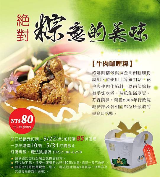 嚴選圓糯米與黃金比例咖哩粉調配,並使用上等鈕扣菇、花生與牛肉作餡料,以南部粽特有手法水煮,粒粒飽滿厚實、芬香撲鼻。榮獲2006年行政院經濟部及各相關單位所頒發的優良口味獎。