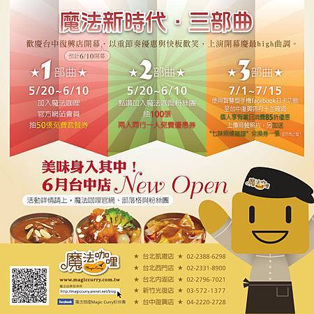 歡慶魔法咖哩成功前進大台中地區,即日起推出魔法新時代三部曲活動,邀大家一起歡慶魔法咖哩台中復興店開幕。