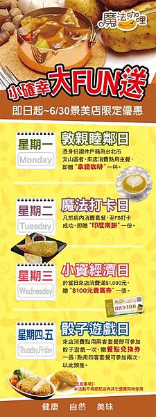 來店消費點用兩客套餐即可參加骰子遊戲一次,免費贈送「餐點兌換券」乙張;點用四客,可參加兩次,以此類推。(限下次使用)
